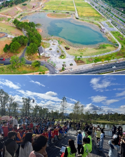 龍州濕地是九龍江流域山水林田湖草沙一體化保護和修復項目海綿城市建設范例工程,也是我市2023年十大重點攻堅項目北部新城建設的“點睛之筆”,主要使用的是國家政策補助資金。項目占地面積約20公頃,通過“護山、理水、營林、興田、清湖、豐草”六大舉措,構建了蓄洪湖區、生態修復區、農田區及休閑區多樣用地,同時,設置了蓄洪湖、濕地步道、山谷攔蓄、引水工程等海綿設施,實現“城在田中田在城中”山水田園與城市和諧共生的美好景象。