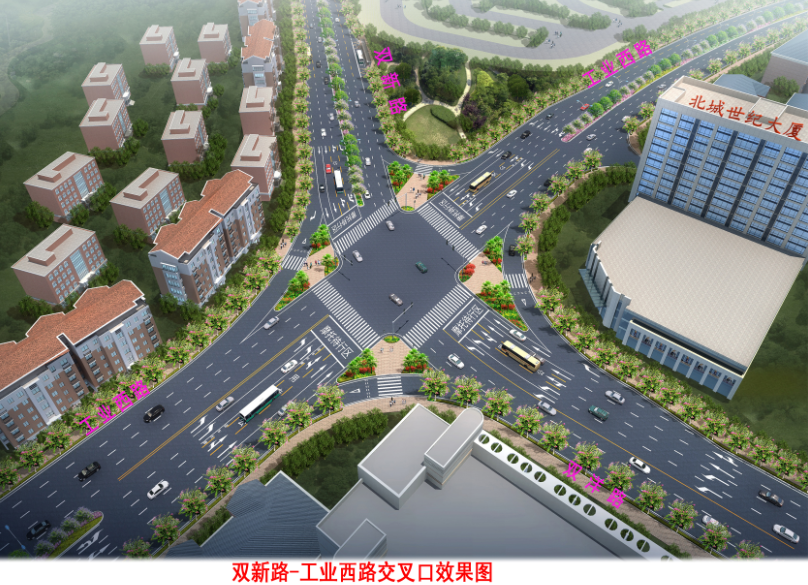 雙新路(工業西路-城北小學)項目位于龍巖市城區的中西部,起于工業西路與雙洋路交叉口,終于青云路,沿線經謝洋保障房、城北中、小學、龍州工業園區廠區,是交易城通往龍州工業園區廠區的一條便捷通道,道路全長1179米,寬34米,總投資約6.5億元。項目的建成對進一步擴大城區范圍,帶動沿線土地開發,解決城北中、小學交通,促進龍州工業園區發展、完善路網格局具有重要意義。