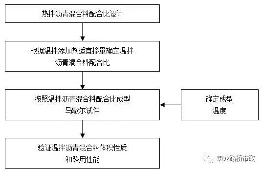 溫拌瀝青混合料的生產(chǎn)配合比設計與熱拌瀝青混合料的設計方法基本一致,只是溫拌瀝青混合料室內成型溫度不同(比熱拌瀝青混合料低20-25℃),溫拌瀝青混合料配合比設計過程見下圖。溫拌添加劑摻量很小,故理論密度計算時可不考慮其影響。
