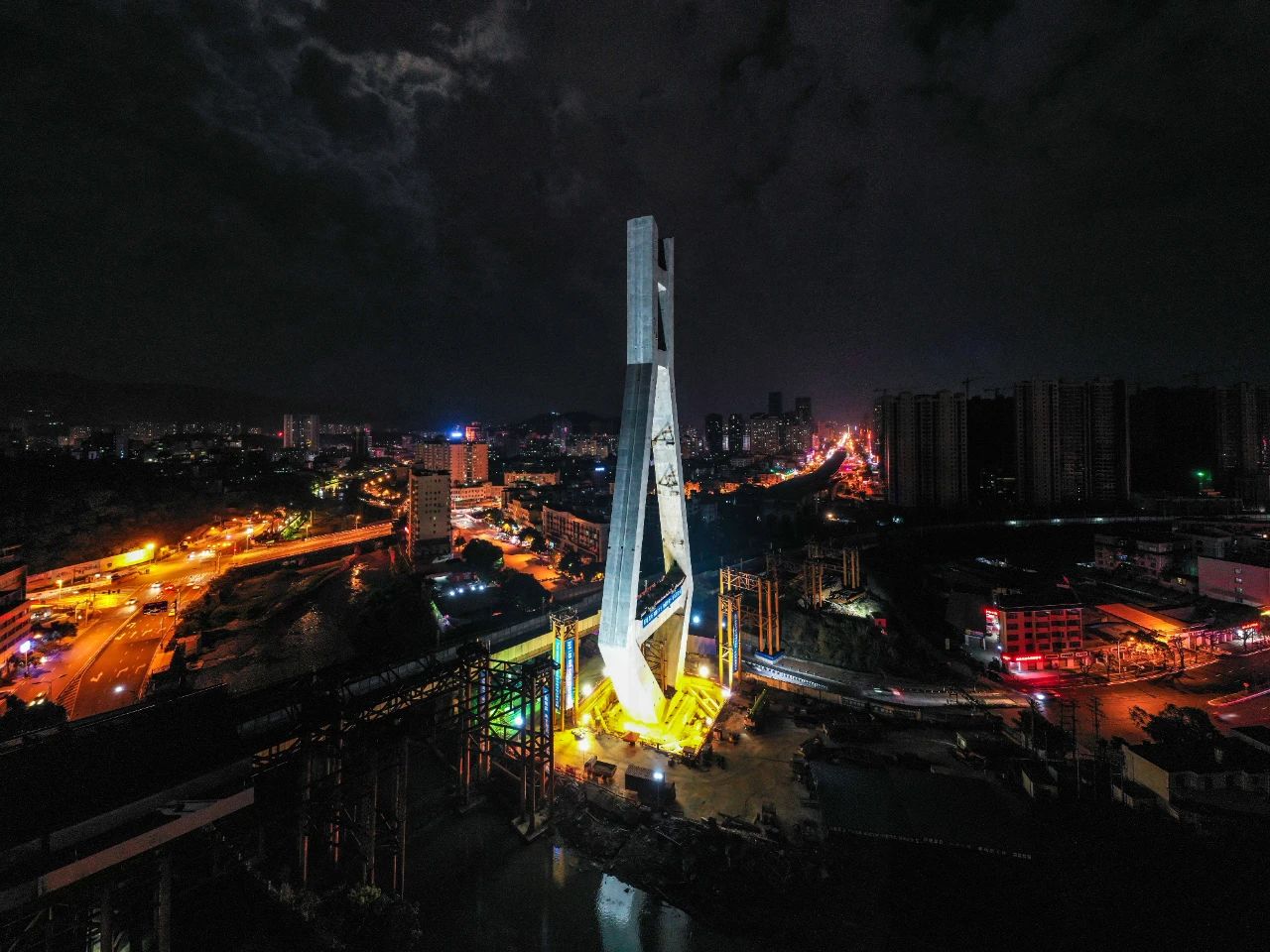 4月10日凌晨,龍巖大橋百米高萬噸主塔完成逆時針69度旋轉,歷時1小時20分鐘左右安全到達指定位置。
